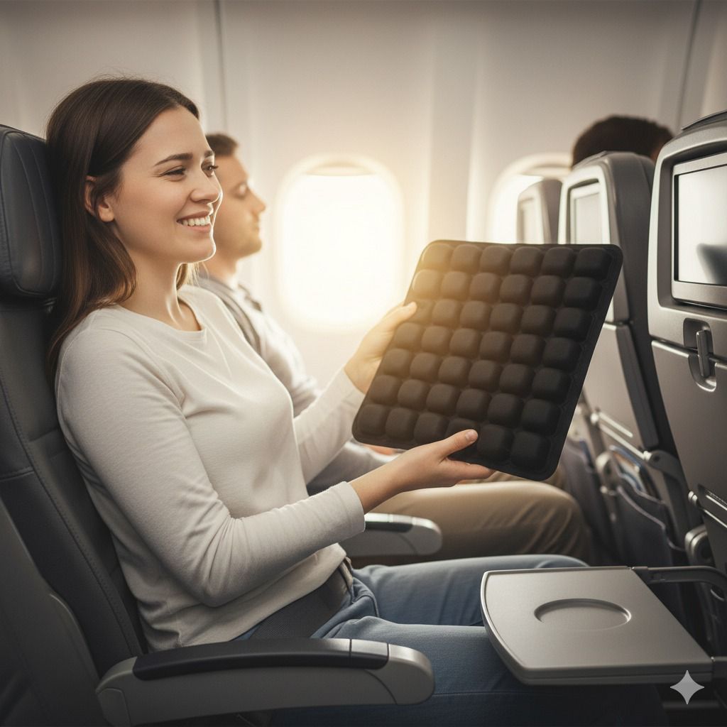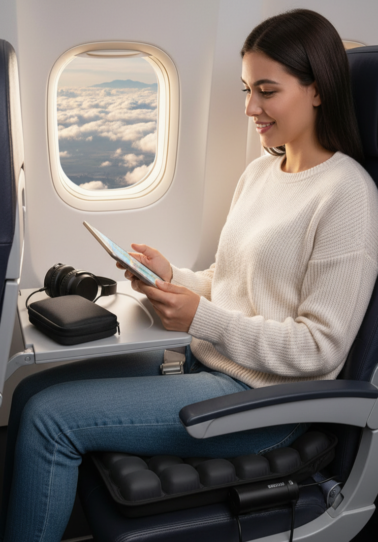 The unique inflatable design distributes weight evenly, so you can sit longer without strain. Perfect for flights, car rides, or office chairs.
